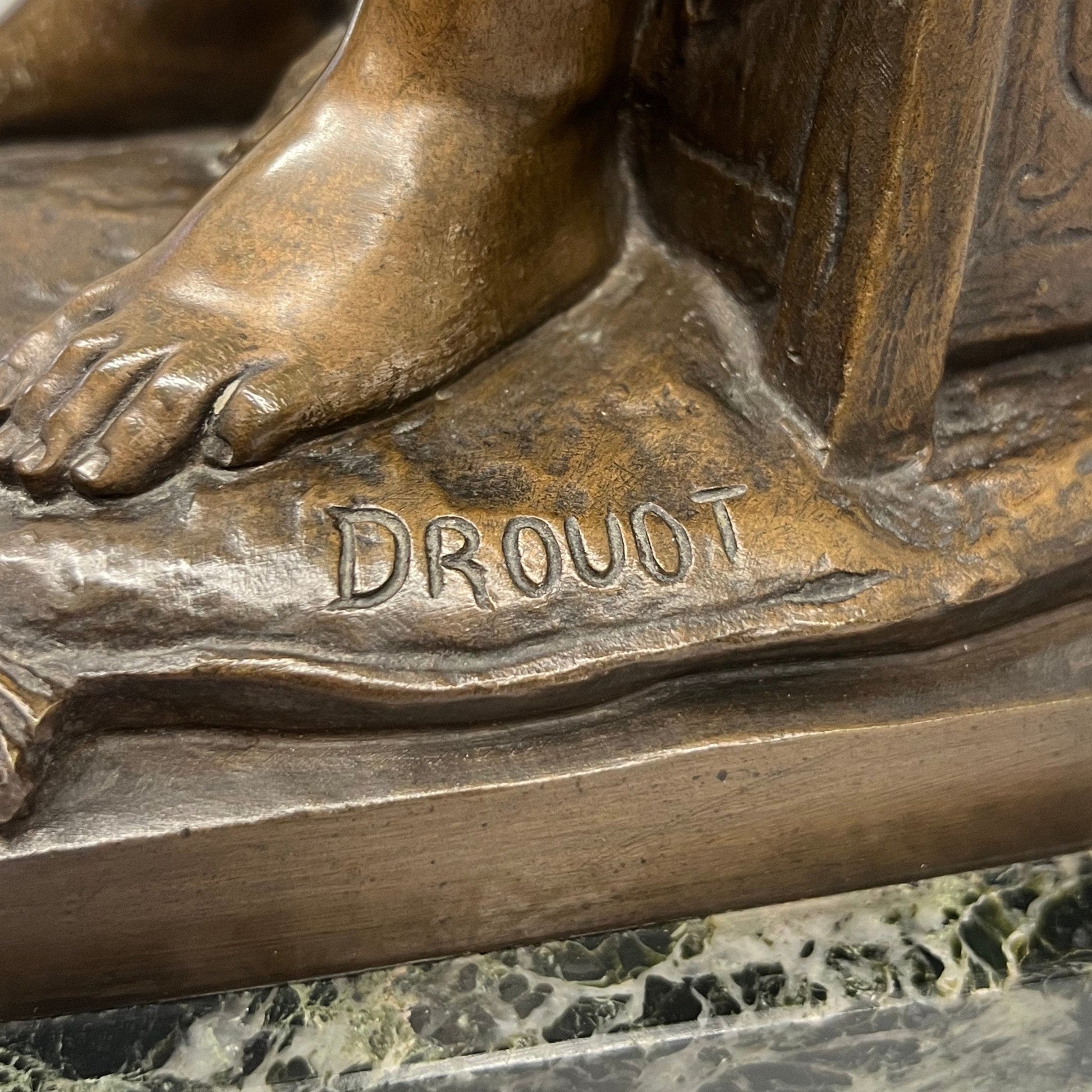 “Fillette” by the French sculptor Edouard Drouot (1859-1945). This 17.72” artwork depicts a young girl standing with her hands clasped and looking upward, showcasing a rich, nuanced brown patina. This piece is a post-mortem edition casting, produced from the artist’s original work after his death. Drouot is renowned for his realistic and graceful depictions of figures, and his works are often found in various collections and at auction.